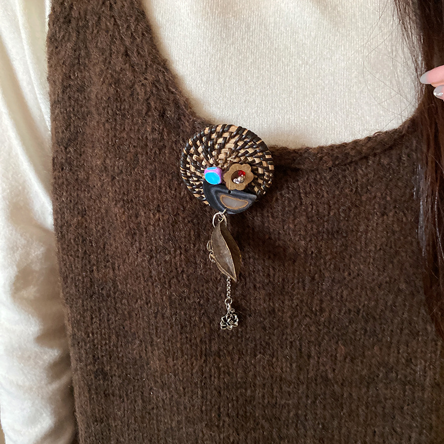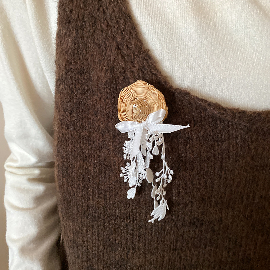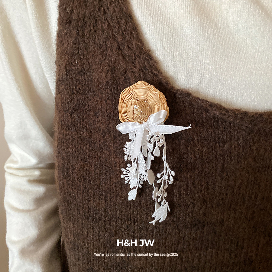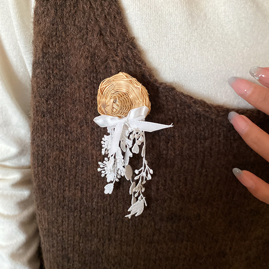 Vine woven hollow flower bow tassel brooch, fresh and sweet vacation style, chest flower, niche high-end accessory for women